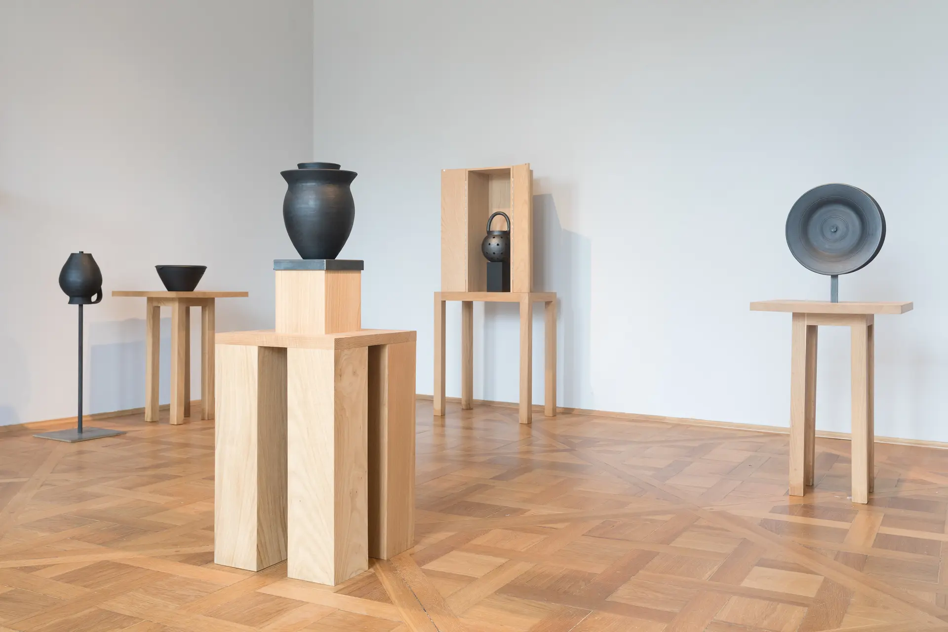Keramiken auf Sockeln und Tischen